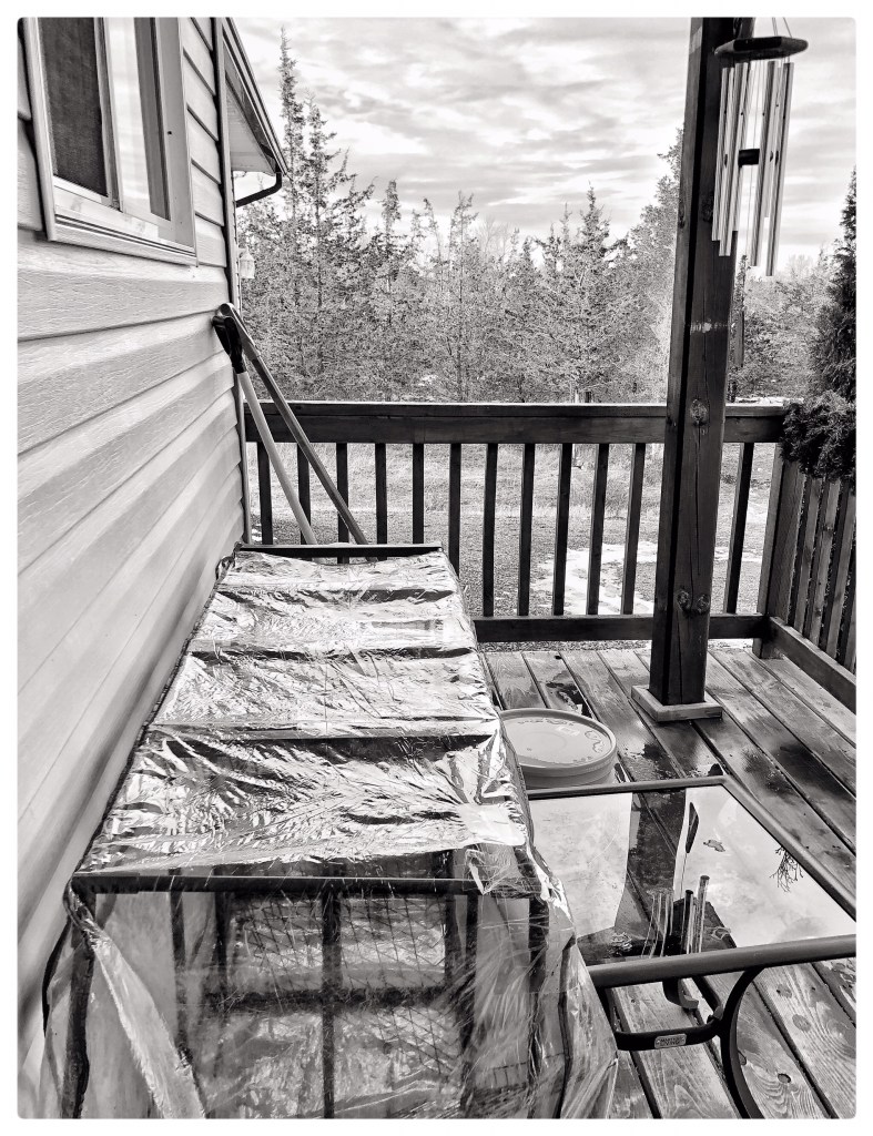 Early March winds cleaned off the porch last night…threw the empty greenhouse into the yard. Now it lies on its side pinned…kept in place.