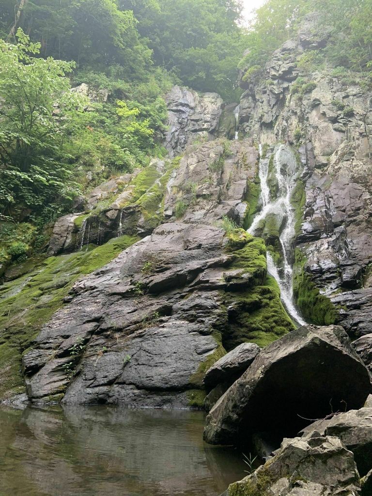 The trail heads downhill. Sweat clings to my skin and shirt as the day’s heat increases. A turn, then some leveling out, before reaching the observation point for the falls. A thin stream falls from an impressive height, but the falls themselves fail to impress. We continue, reaching the fire road upon which we ascend back toward the trailhead. A turn on the ever-present Appalachian Trail, then one more, back onto the South Falls River trail. I devour a peanut-butter and Jelly sandwich at a picnic table in the shade. We head back to the resort, wondering whether the hiking in Shenandoah will truly be worth it.